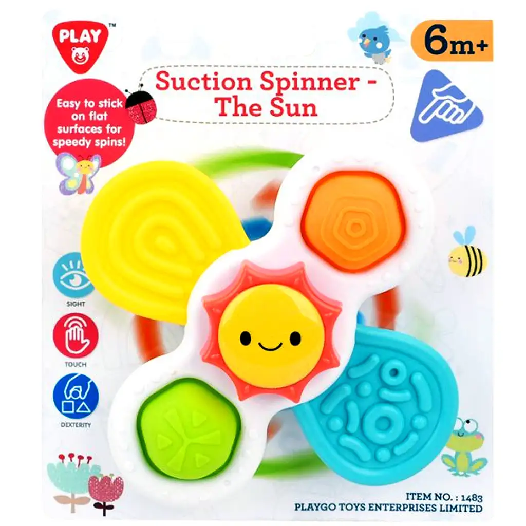 Diese bezaubernde, lächelnde Sonne ist nicht nur ein fröhlicher Begleiter für Babys, sondern auch ein hervorragendes Förder-Spielzeug! Die Playgo drehende Saugnapf-Sonne wird bereits ab 6 Monaten empfohlen und ist speziell auf die sensorische Entwicklung der Kleinsten ausgerichtet. Die farbenfrohen, unterschiedlich gemusterten „Sonnenstrahlen“ ziehen die Kleinen visuell in ihren Bann, während beim Drehen die Feinmotorik und die Augen-Hand-Koordination gefördert werden.