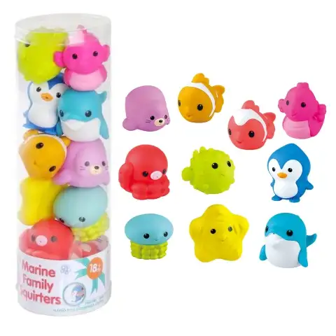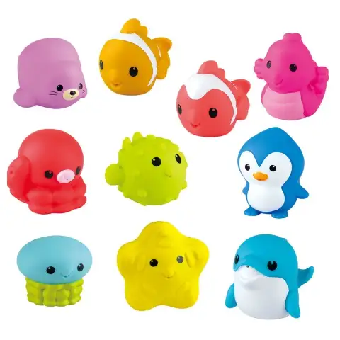Diese niedlichen Baby-Badetiere werden das Baden zu einem riesigen Spaß machen. Jedes der fröhlichen kleinen Tiere spritzt, wenn man sie mit Wasser füllt. Im Set befinden sich insgesamt 10 bunte Wassertiere, sodass die Kinder auf einen Pinguin, einen Oktopus, eine Qualle, 2 Clownfische, einen Delfin, eine Robbe, einen Seestern, ein Seepferdchen und einen Kugelfisch treffen können. Das Set wird in einer praktischen, zylinderförmigen Aufbewahrungsbox geliefert.