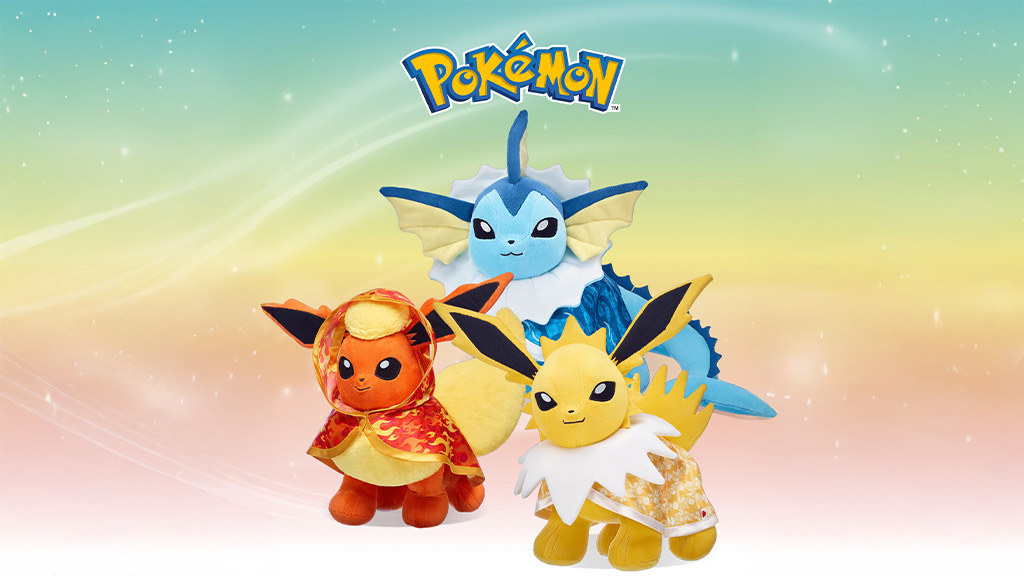 Familien können entweder online oder im lokalen Build-A-Bear Workshop Geschäft vorbeischauen, wo sie alle acht Eevee-Entwicklungen – Flareon, Jolteon, Vaporeon, Espeon, Umbreon, Leafeon, Glaceon und Sylveon – als Plüschversion gestalten können.
