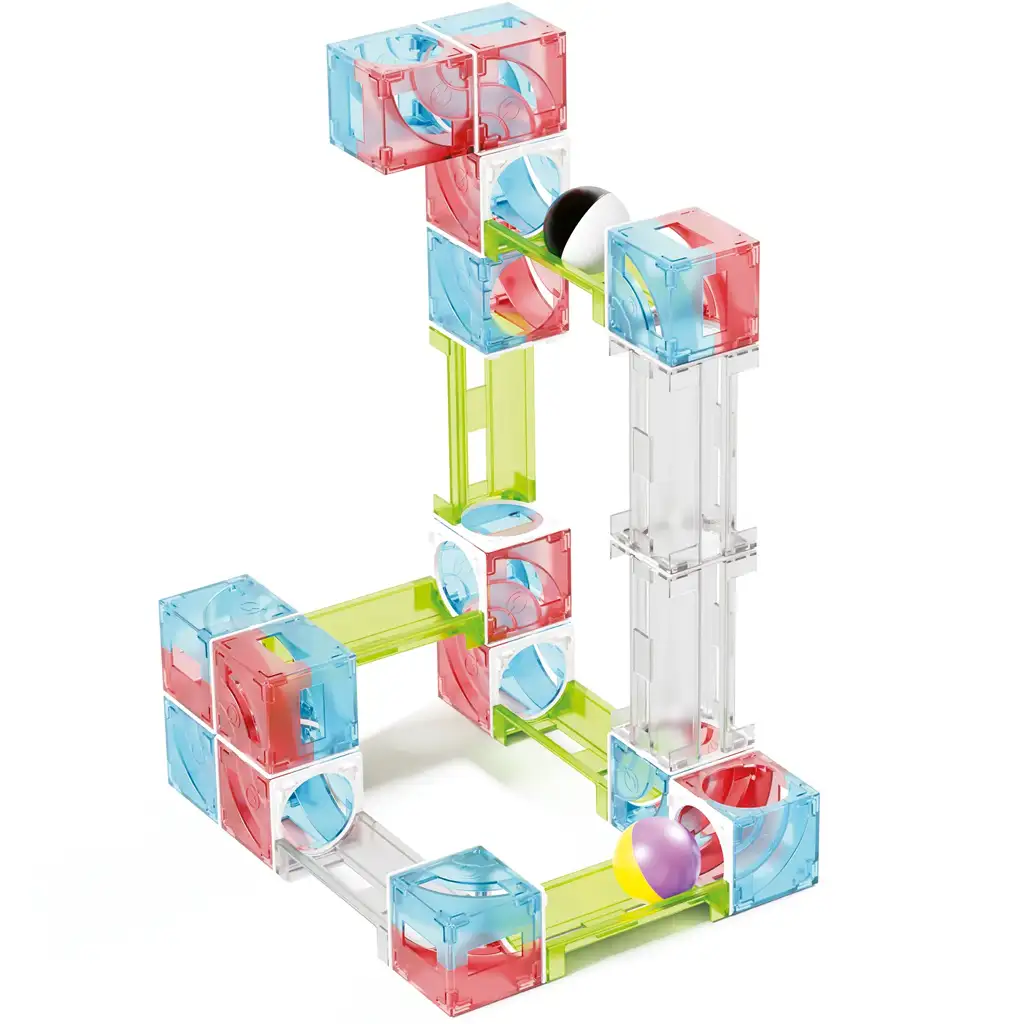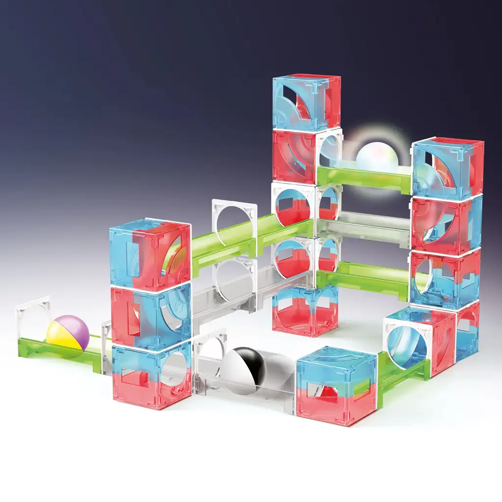 Das Set enthält auch eine leuchtende Kugel, die sich während der Bewegung automatisch beleuchtet und das Spiel auch im Dunkeln zu einem faszinierenden Erlebnis macht. Die Kugeln sind in verschiedenen Farben und Mustern gestaltet und bieten so auch visuell spannende Eindrücke. Die hochwertigen, transparenten Kunststoffelemente lassen sich stabil ineinander stecken; die bunten Würfel sind leicht zusammenzusetzen und auseinanderzunehmen – auch für kleine Hände.
