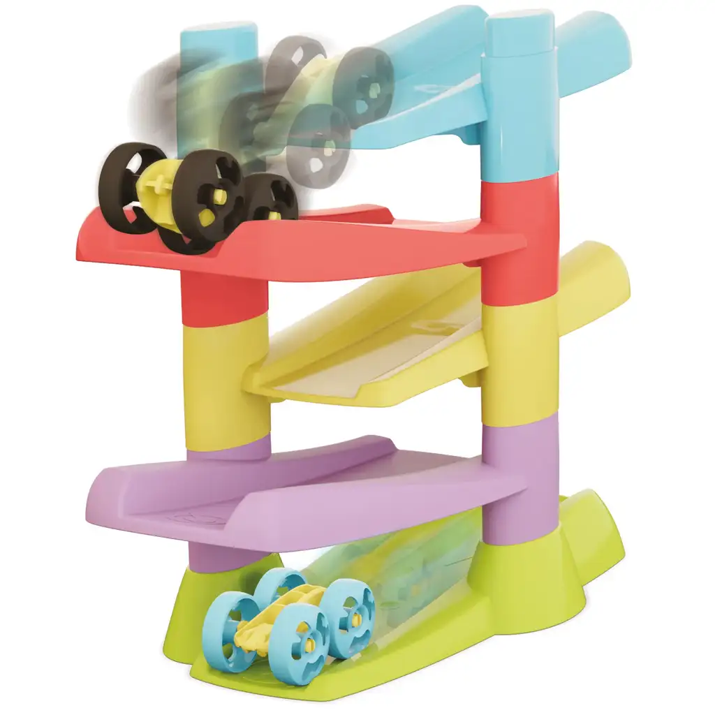Der Turm führt die kleinen Flip-Autos über 5 Ebenen, wobei sich die Autos am Ende jeder Rampe automatisch überschlagen und ihre Fahrt hinab fortsetzen. Diese „Flip“-Bewegung ist nicht nur sehenswert, sondern hilft Kindern dabei, Ursachen und Wirkungen zu verstehen und motiviert sie zum Wiederholen, Experimentieren und Entdecken.