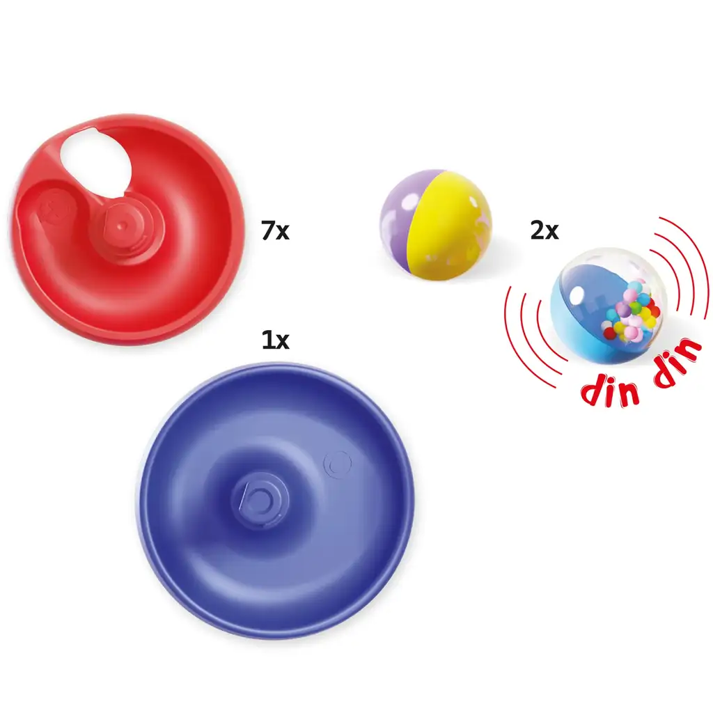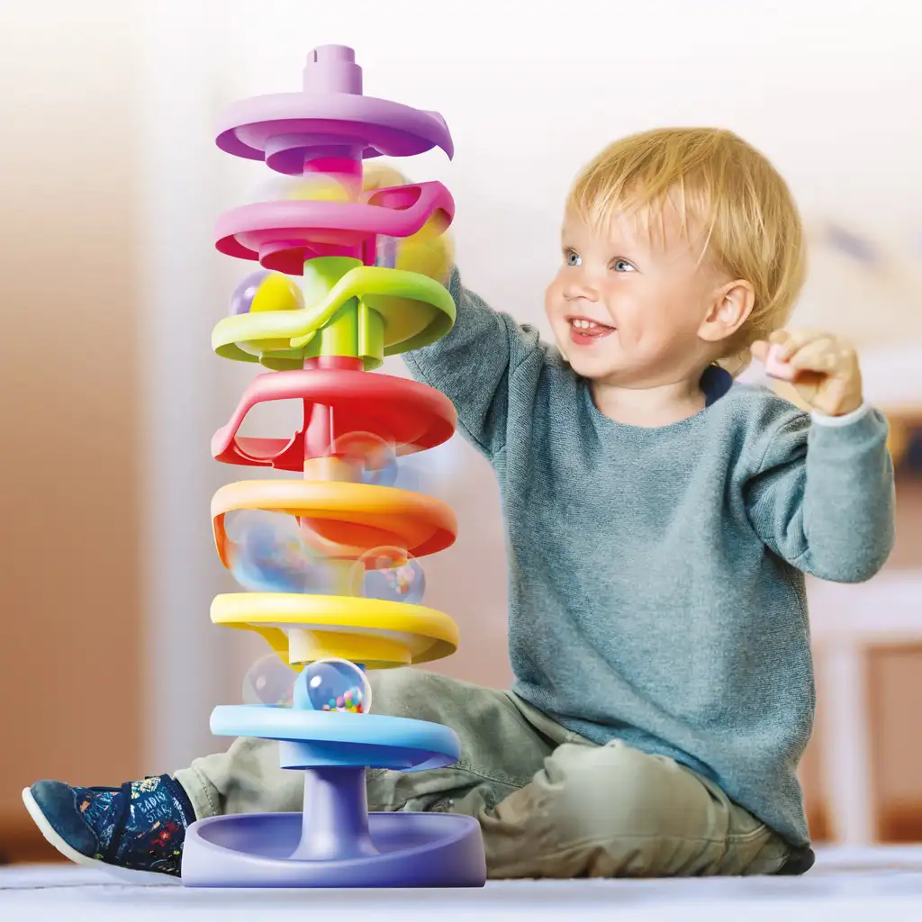 Das Set enthält 7 Spiralbahnen, einen stabilen Sockel und 2 Kugeln – eine davon ist eine farbige Rasselkugel, die beim Rollen Geräusche macht und so das Erlebnis noch spannender gestaltet. Die andere Kugel hat ein kontrastreiches, buntes Muster, das die Aufmerksamkeit des Babys auf sich zieht und die Beobachtungsfähigkeit fördert. Der Turm ist leicht zusammenzubauen und die Elemente lassen sich stabil ineinander stecken. Beim Spielen werden nicht nur die Handbewegungen geschult, sondern die Kinder beginnen auch, Ursache-Wirkung-Zusammenhänge zu verstehen.