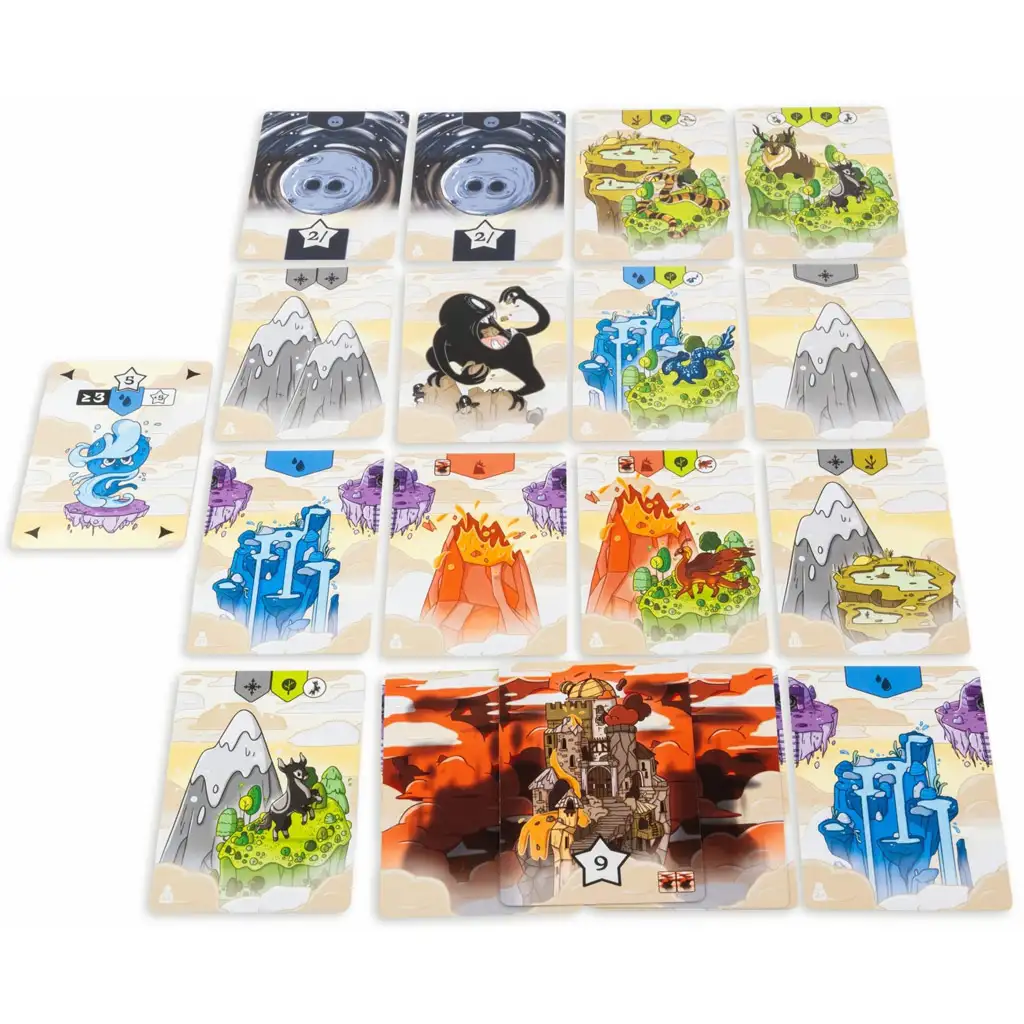 In diesem besonderen Universum ist jede Karte ein weiteres Mosaikstück der Welt: Eissäulen, Vulkane, Wälder, Schattenstädte und mysteriöse Wesen bevölkern die Landschaft. Der Zauber des Spiels liegt darin, die Karten nicht nur geschickt zu platzieren, sondern sie auch gut zu timen – denn manche Karten können sich gegenseitig beeinflussen. Ein Vulkan kann zum Beispiel viele Punkte bringen, kann aber, wenn er schlecht platziert wird, wichtige Kombinationen zerstören.