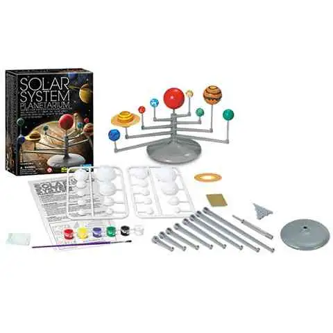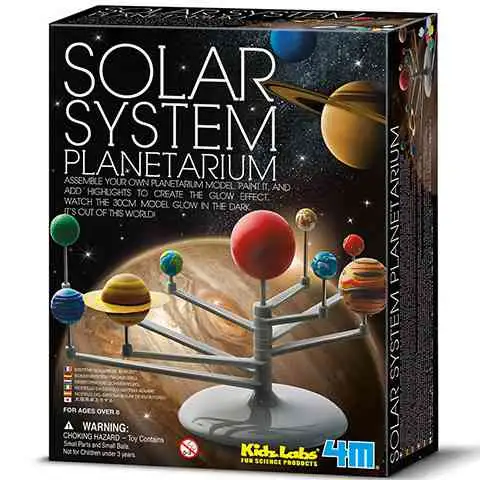 Unter den zahlreichen wissenschaftlichen Spielen von 4M ist das Planetarium des Sonnensystems vielleicht das auffälligste, denn es enthält ein 30 cm großes Sonnensystem, das du selbst zusammenbauen kannst und das sogar im Dunkeln leuchtet. Zuerst musst du den drehbaren Ständer zusammenbauen, dann die weißen Planeten-Elemente, und vergiss nicht, die Ringe beim Saturn anzubringen. Danach musst du nur noch die Planeten anmalen und an ihren Platz setzen. Im Set findest du auch fluoreszierende Farbe, mit der du deinen Lieblingsplaneten bemalen kannst, damit er im Dunkeln leuchtet.