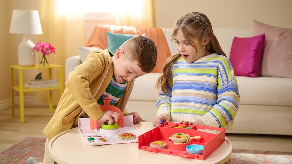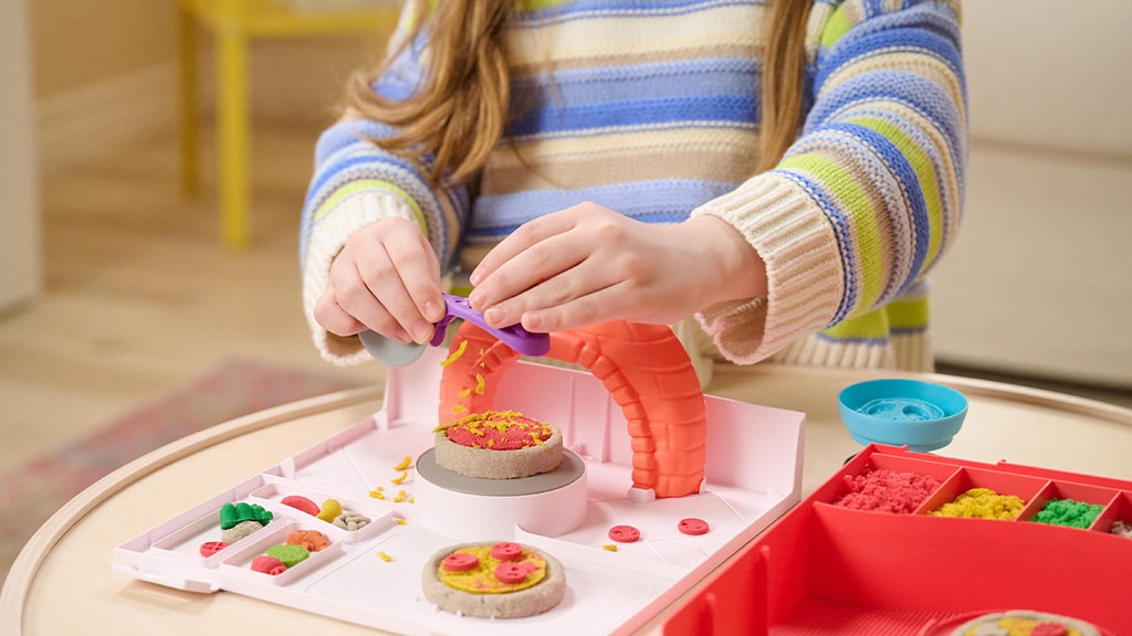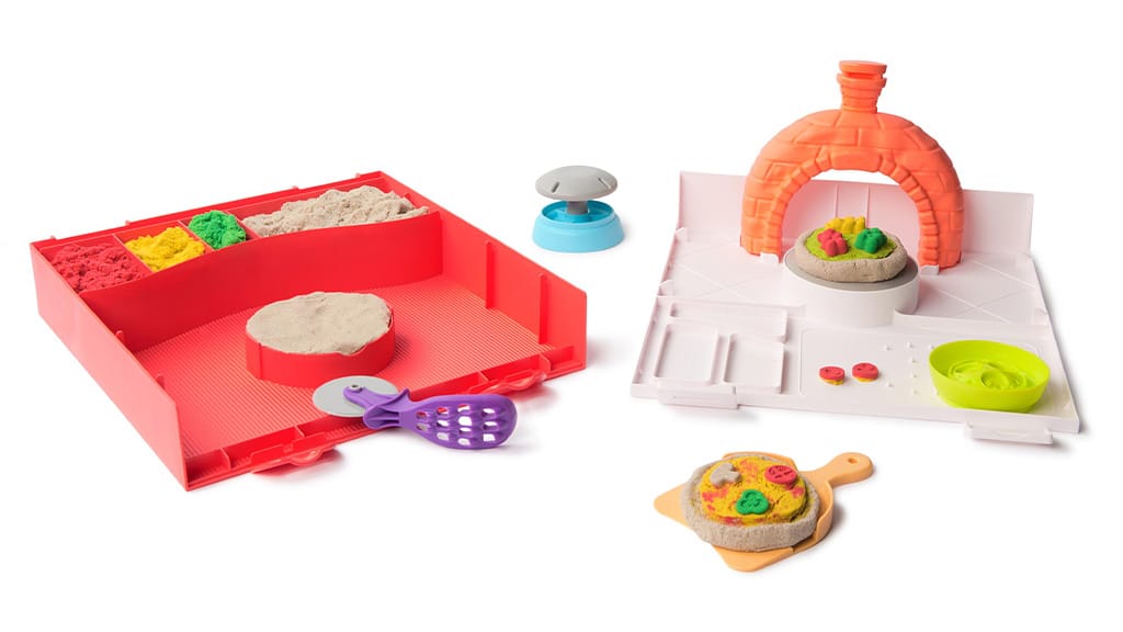 Die Kinder können eigene, individuelle Pizzakombinationen mit vier verschiedenen Farben von kinetischem Sand und Belagformen herstellen und sie dann in den imaginären Pizzaofen legen, um zu sehen, wie die Pizzen „gebacken“ werden und aufgehen. Dieses kreative Spiel fördert die Feinmotorik, die Fantasie sowie das Erkennen von Farben und Formen. Mit den Produkten der Marke Kinetic Sand können Kinder stundenlang spielen, während sie ihre eigene Pizzeria führen, verschiedene Beläge und Farbkombinationen ausprobieren und ihre Kreationen sogar mit Freunden teilen.