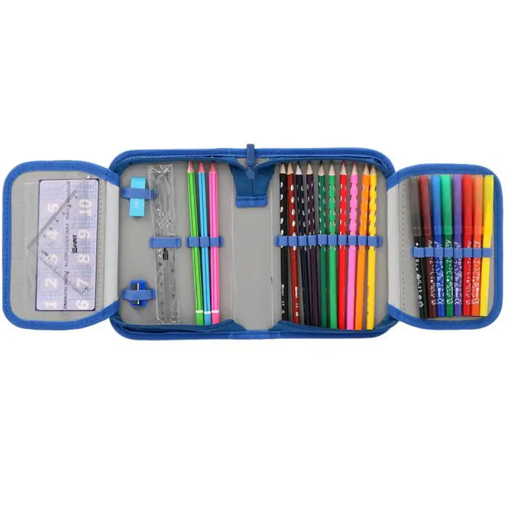 Dieses Federmäppchen ist nicht nur cool, sondern auch äußerst praktisch: Es lässt sich mit einem Reißverschluss öffnen und bietet im Inneren Platz für insgesamt 28 verschiedene Schulutensilien. Die Ausstattung enthält alles, was ein Grundschüler benötigt – egal ob zum Schreiben, Malen, Zeichnen oder Organisieren. Bleistifte, Filzstifte, Farbstifte und Lineale sind ordentlich unter Gummibändern verstaut, sodass alles immer griffbereit ist.