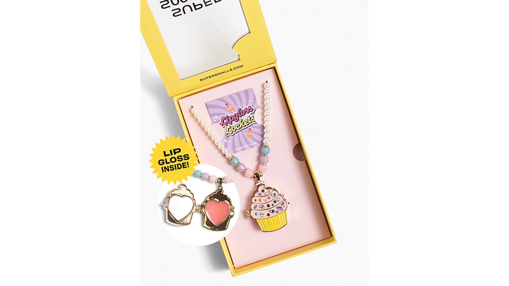 Dieses Cupcake-Thema-Accessoire ist aufklappbar und enthält einen Lipgloss, der nach Erdbeer-Cupcake duftet. Wenn der Lipgloss aufgebraucht ist, erwartet die Kinder eine Überraschungsbotschaft, bevor sich der Cupcake in ein besonderes Erinnerungsmedaillon verwandelt.