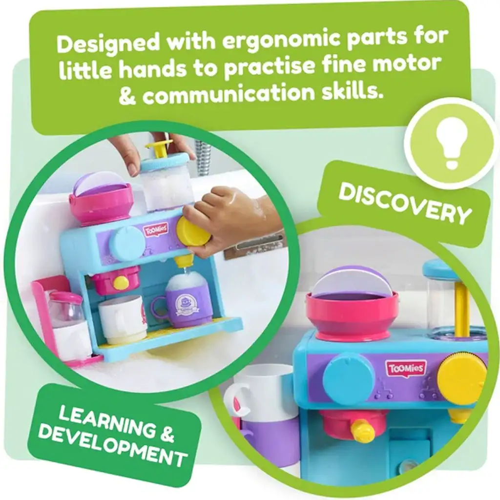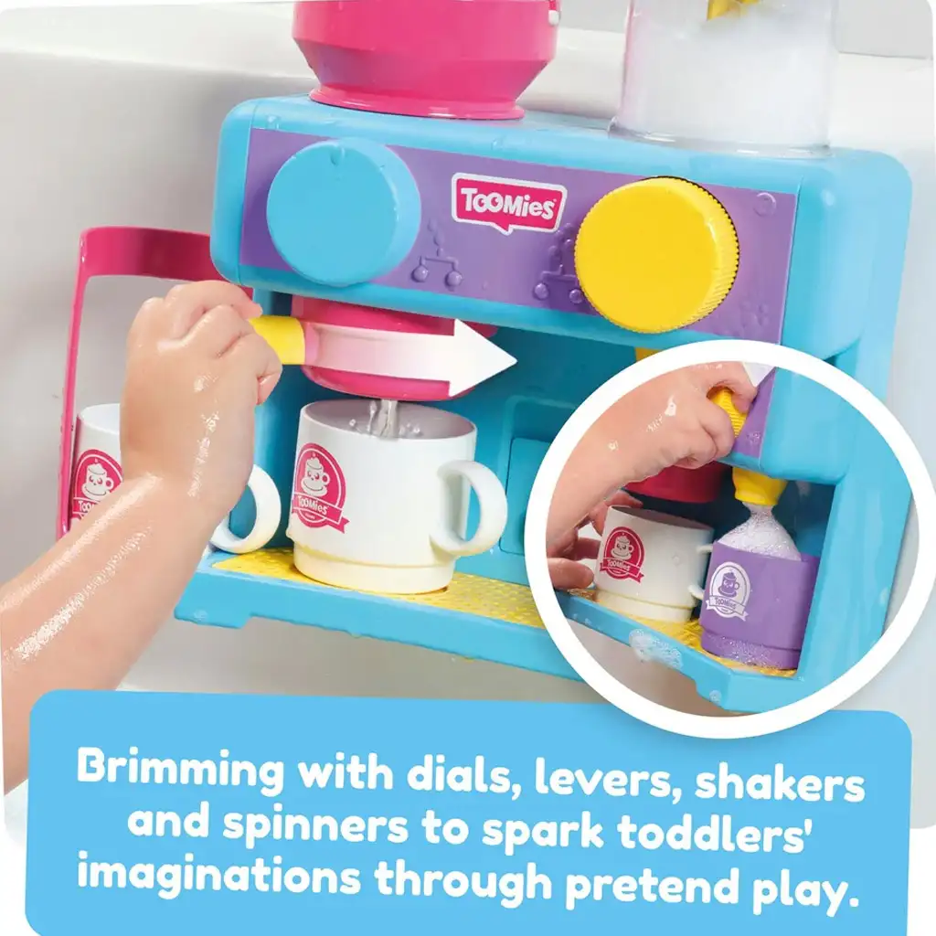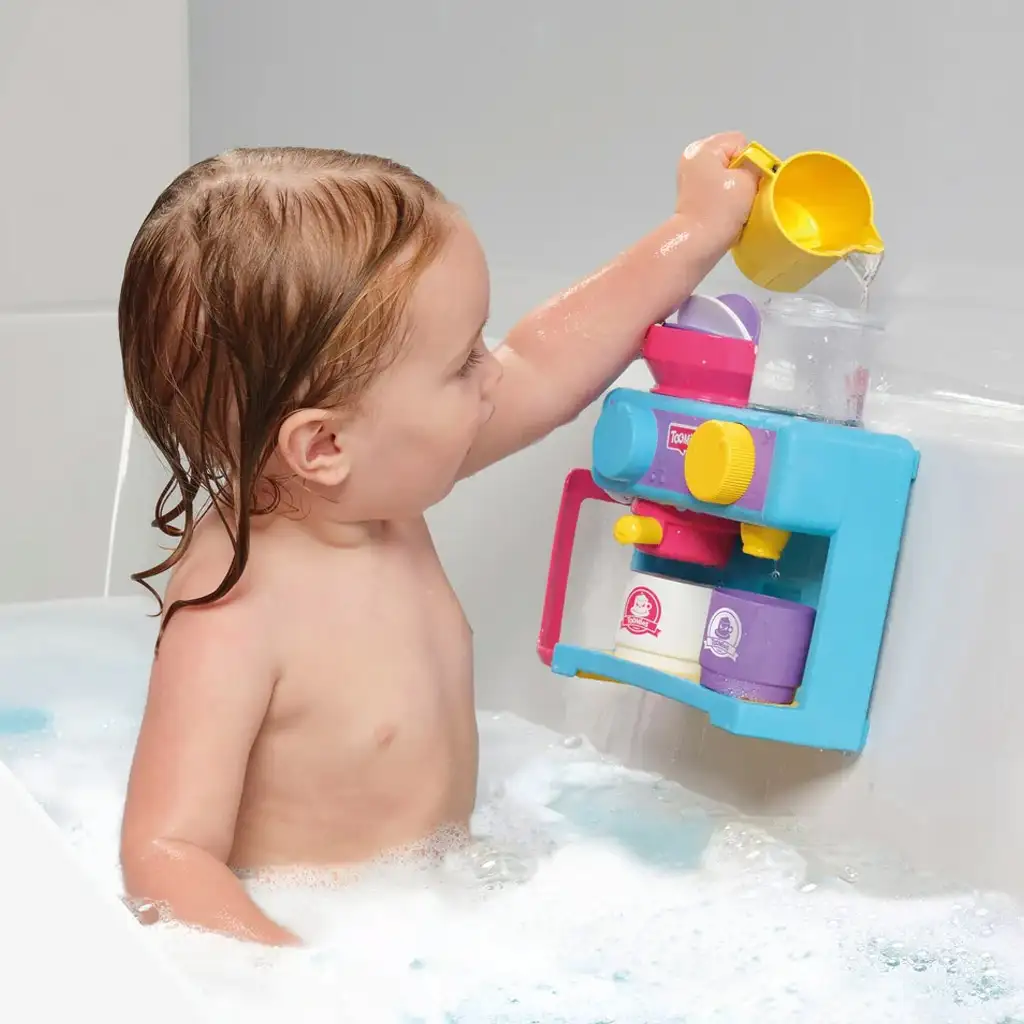 Die Tomy Toomies Badezone erfüllt den Traum eines jeden kleinen Cafébesitzers - ein Café in der Badewanne! Dieses Spielset aus hochwertigem Kunststoff enthält eine Kaffeemaschine, Tassen, einen Zuckerdosierer und eine freundliche kleine Sahnekännchen. Mit der Kaffeemaschine können die Kleinen das Badewasser einfüllen und auf verschiedene Weise aktivieren, um den duftenden Badewasser-Espresso zu "brühen". Die Tassen des Sets können bequem in der neben der Kaffeemaschine angebrachten Halterung aufbewahrt werden.