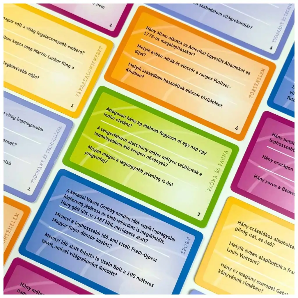 Geschwindigkeiten, Jahreszahlen, Längen, Gewichte, Rekorde – während des Spiels kommen viele interessante Daten und überraschende Fakten ans Licht. Insgesamt erwarten euch 1188 Fragen in sechs Themenbereichen: Gesellschaft, Natur, Wissenschaft, Geschichte, Sport und viele andere spannende Gebiete. Das gemeinsame Tippen, die Diskussionen und Wetten schaffen eine besondere Atmosphäre, während ihr ganz nebenbei lernt. Perfekte Wahl für Familienabende und Treffen mit Freunden, bei denen Lachen und gesunder Wettkampf garantiert sind.
