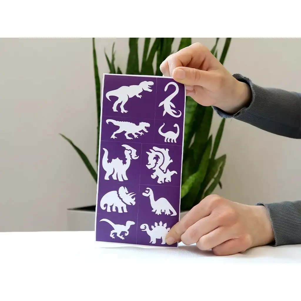 Die Schablonen sind mehrfach verwendbar, was sie nicht nur kreativ, sondern auch praktisch und sparsam macht. Außerdem fördern sie die Feinmotorik und die Fantasie der Kinder. Das Glitzertattoo hält sogar mehrere Tage, sodass die kleinen Dinosaurier-Fans ihre eigenen kleinen Kunstwerke stolz am Arm, Bein oder sogar im Gesicht tragen können.