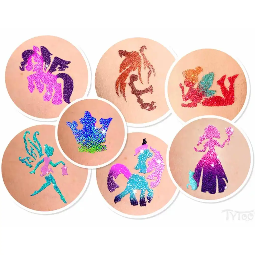 Das TyToo LilyCorn Glitzertattoo-Set zaubert deinem Kind ein wirklich märchenhaftes Erlebnis in den Alltag. Wenn es Einhörner, Feen und Prinzessinnenmotive liebt, bereitest du ihm mit diesem Set garantiert Freude. In der Schachtel findet ihr 28 detailreiche Schablonen, darunter Einhörner, schwebende Feen, Kronen und zauberhafte Märchenhelden. Die Motive lassen sich leicht anbringen, sodass schon beim ersten Mal wunderschöne, funkelnde Tattoos entstehen.