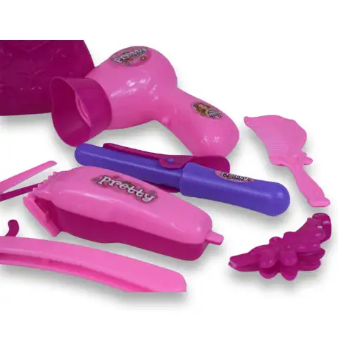 - Mit Spielzeug-Haartrockner, Haarschneider und Lockenstab