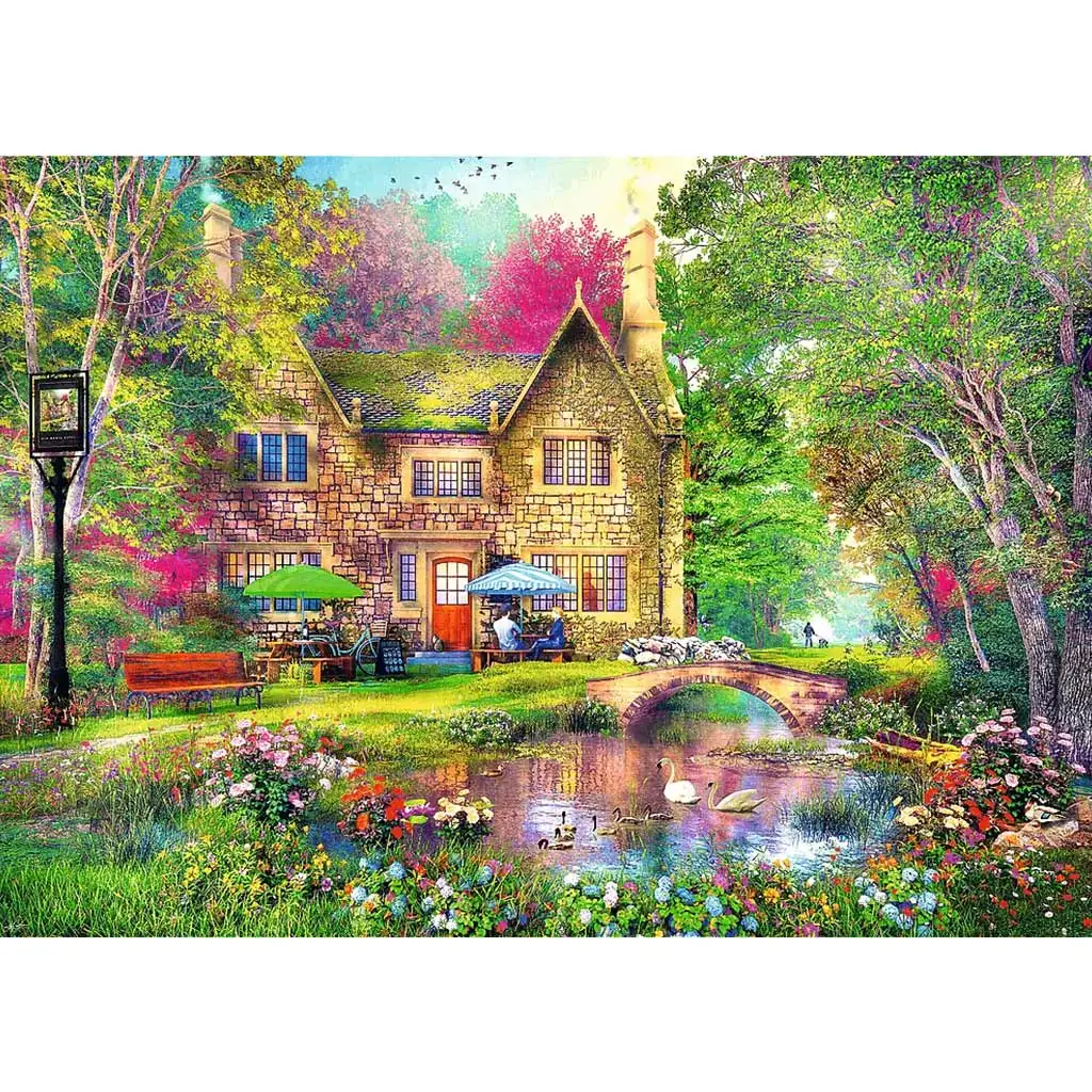 Lassen Sie sich von diesem märchenhaften, bildhaften Puzzle in eine friedliche, traumhafte Welt entführen! Das Puzzle „Waldidylle – Ruhe im Herzen der Lichtung“ ist ein Meisterwerk aus 1000 Teilen, das die beeindruckende künstlerische Vision von Dominic Davison widerspiegelt. Das Bild zeigt ein gemütliches Steinhaus, umgeben von Bäumen, mit einem blühenden Garten, einem gewundenen Bach sowie Enten und Schwänen – die Verkörperung von ländlicher Idylle und Frieden.