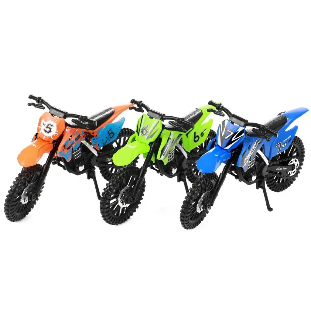 Das Motorrad ist in drei verschiedenen Farbvarianten erhältlich – grün, blau und orange – so können die Kinder sogar eigene Rennen auf ihrer Offroad-Strecke veranstalten. Die detailreiche Verarbeitung, die sportlichen Grafiken und der bewegliche Seitenständer machen das Rollenspiel noch spannender. Das Motorrad besteht aus Metall- und Kunststoffteilen und ist somit sowohl strapazierfähig als auch für kleine Hände leicht zu handhaben.